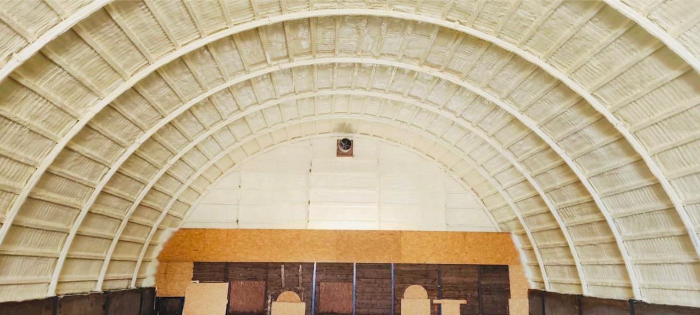 Do realizacji zastosowaliśmy otwartokomórkową pianę PUR UltraPur o doskonałych parametrach izolacyjnych, nanoszoną metodą natrysku wysokociśnieniowego GRACO. Dzięki temu uzyskano równą warstwę izolacyjną o grubości 18–20 cm, idealnie dopasowaną do konstrukcji dachu hali.